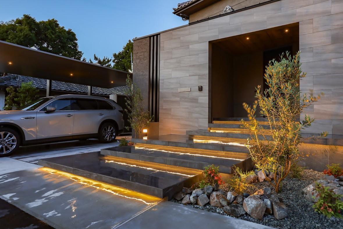 玄関アプローチは流行りの浮き階段とライン照明でシンプルなのに高級感のある外構に。