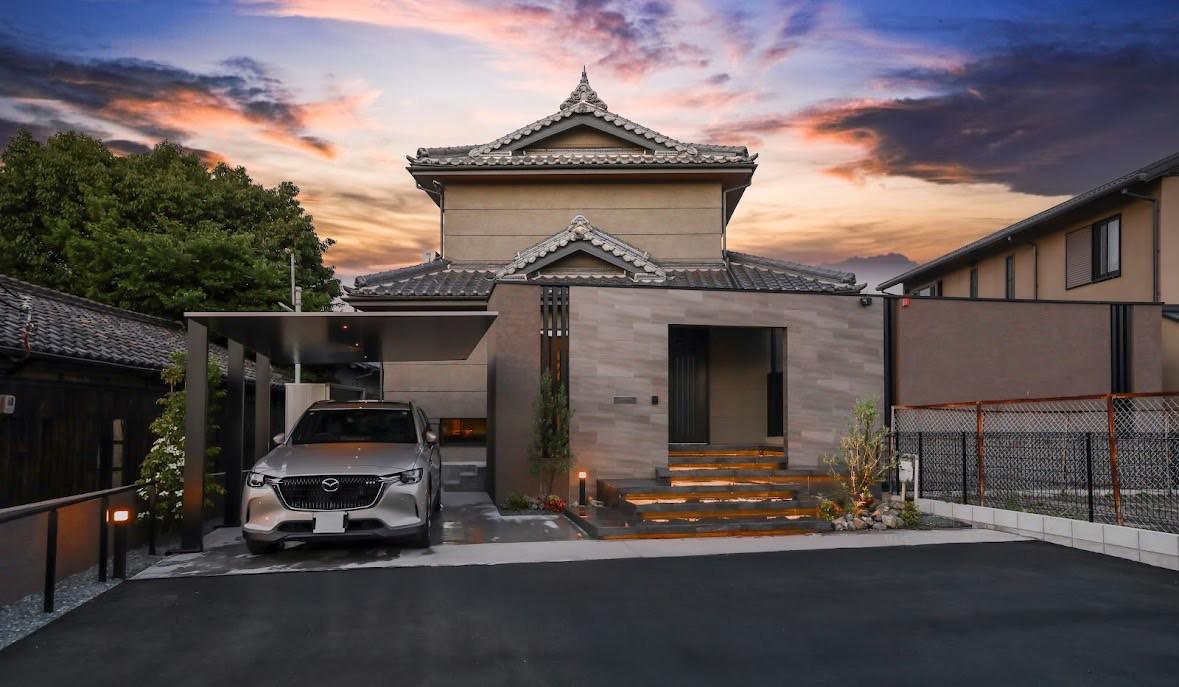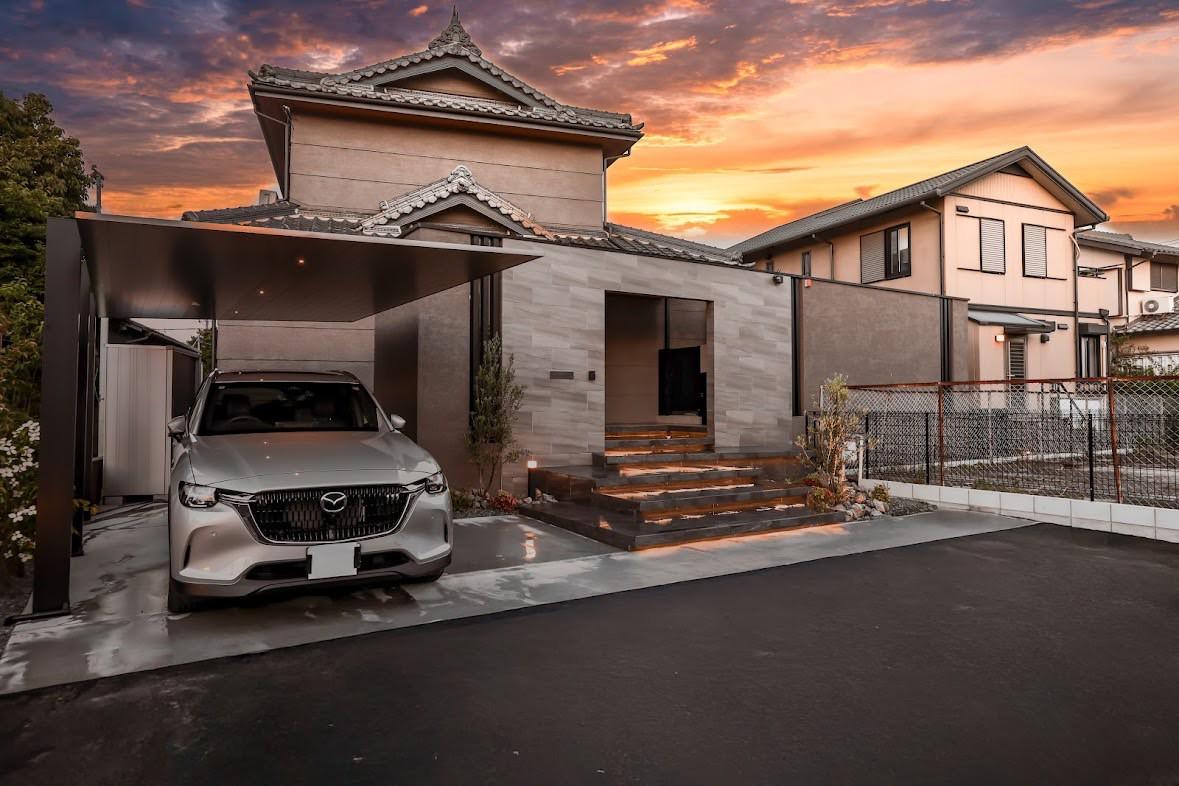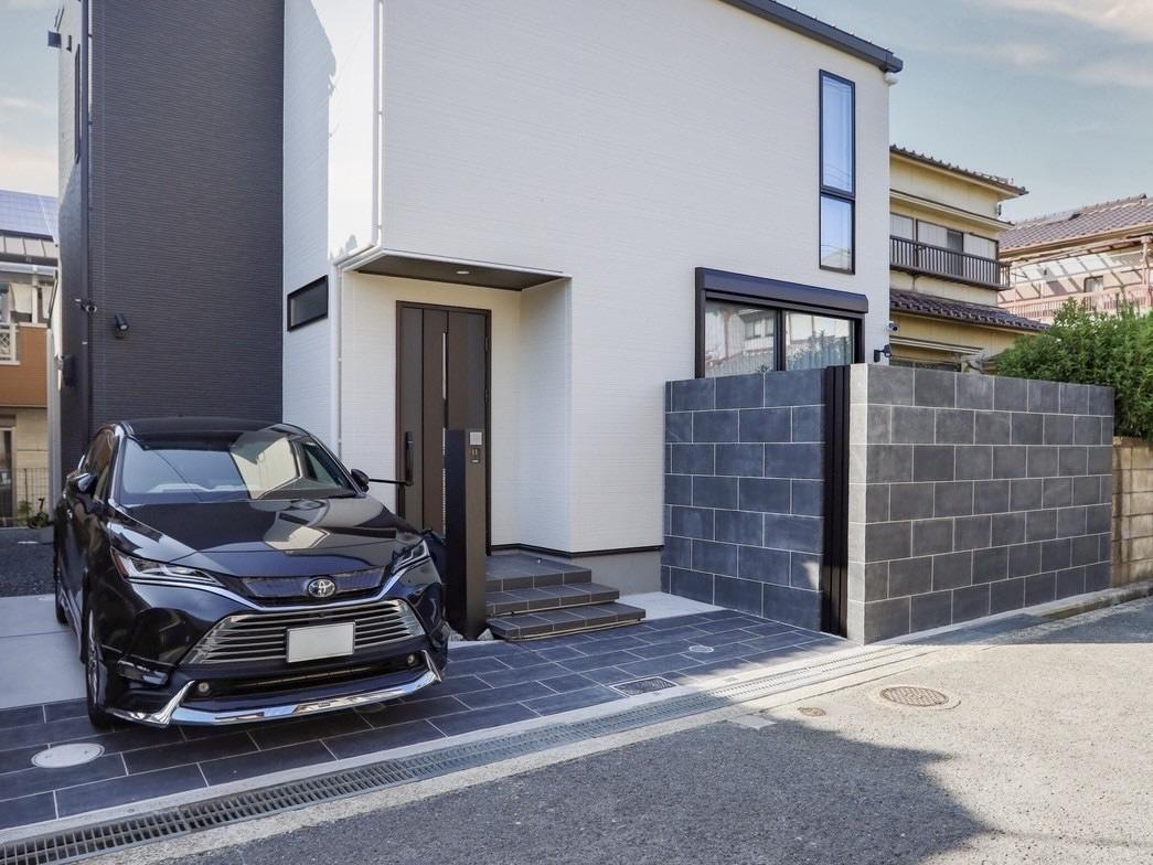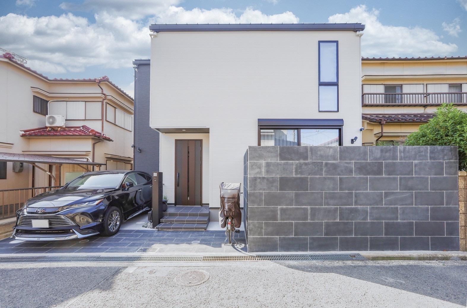 正面に植ったシンボルツリーは、訪れる人々を魅了しながら玄関へと導き、侵入車を防ぐグランドアートウォールの塀にはラメが入っていて、陽が当たると光り輝きます。カーポートは梁を伸ばして駐車しやすい仕様に