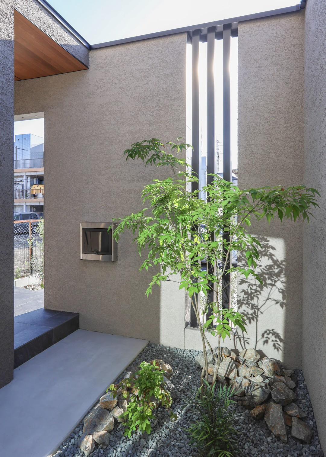 奥まった玄関でもインパクトのある杉板調の壁とフロート階段で映える玄関アプローチに!シンボルツリーとロックガーデン風の植栽でスタイリッシュなデザイン。