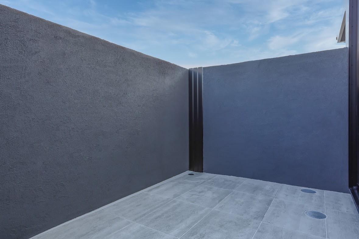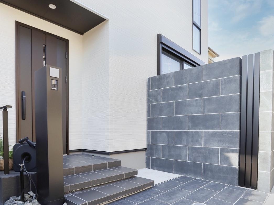 シンボリックな目隠し塀が特徴のスタイリッシュな外構。中は完全プライベート空間で、家族との憩いの場に。奥行きのあるゆったりとしたステップで玄関へと導きます。