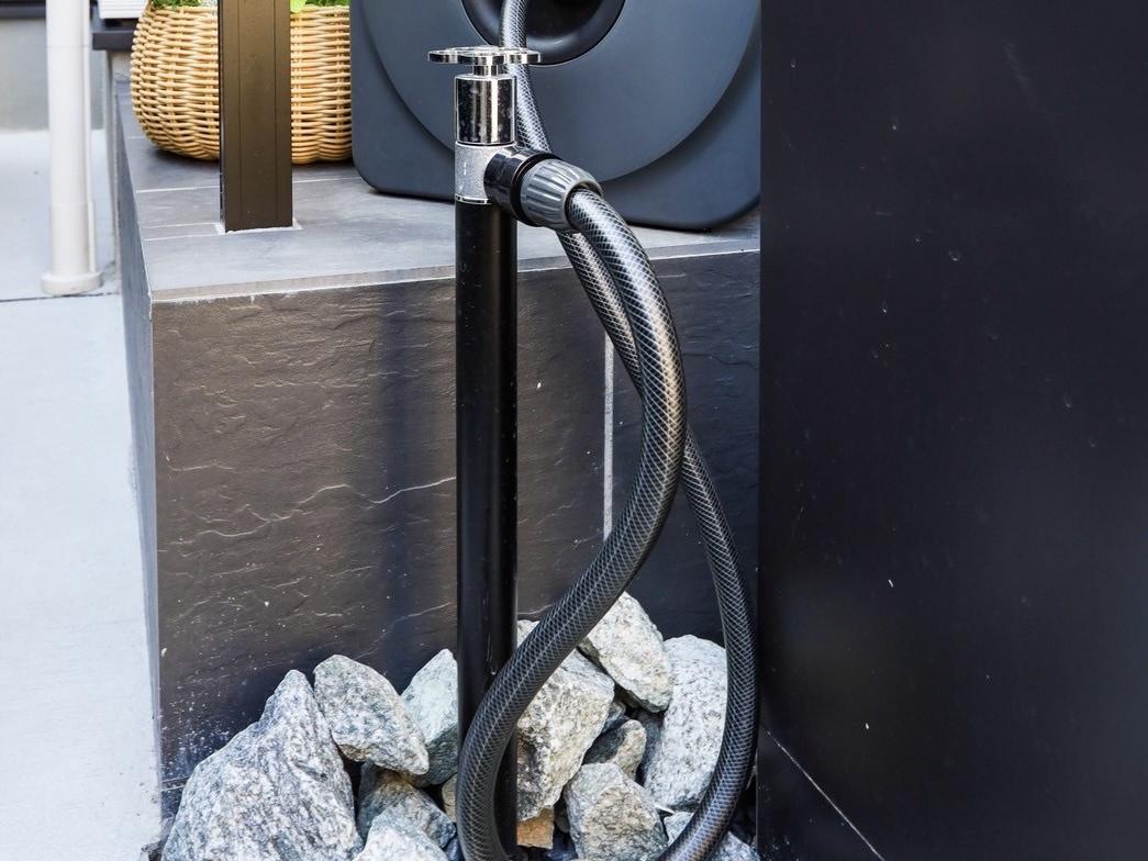 スロープのあった所にはタイル調のデッキを作り、高級感のあるプライベート空間に