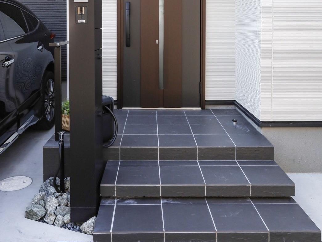 お家の外壁と同じタイルで一体感を出しています。上質で高級感溢れる外構になりました
